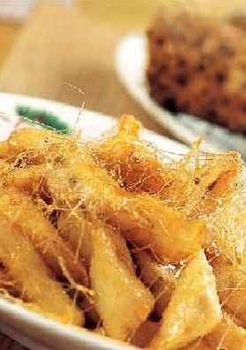 2、鍋內(nèi)倒入油,燒熱,放入白山藥,炸至金黃脆硬時(shí)撈起瀝油;