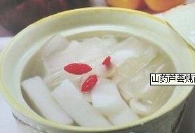 用料原材料:白山藥50克,蘆薈150克,百合50克,清水500克。調味料:冰糖20克。