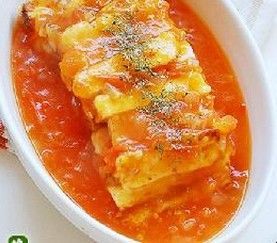 2.鍋里留底油,炒香洋蔥丁,然后把番茄丁一起倒入翻炒,邊炒邊壓,讓番茄成糊狀,加鹽和糖調味,然后倒入水淀粉勾芡即是要澆的汁了
