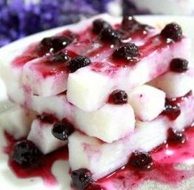 4.煮好的山藥條擺好造型,淋入藍莓醬,即可!放入冰箱,冰鎮后,更加美味。