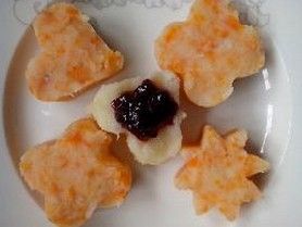 2、再壓成泥狀,壓的時(shí)候加些白糖,再用模具倒成各種形狀即可。吃的時(shí)候也可以加些果醬類。