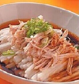 1.雞胸肉洗凈,放入滾沸的水中燙熟后剝絲備用。