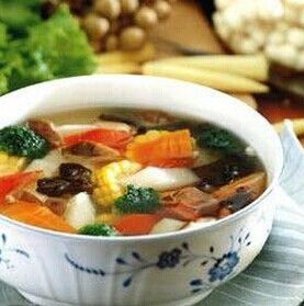 白山藥鮮蔬湯做法介紹 根據中國傳統食療說法,五色入五臟。這道素湯中用到了:青(青花菜)、赤(胡蘿卜)、黃(玉米)、白(山藥)和黑(黑木耳),稱得上五色俱全,可以全方位地增進健康。