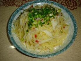 2.將熟的土豆比、山藥絲裝入容器內(nèi),加入適量的麻油、鹽、味精、胡椒粉、白醋、白糖、辣椒末拌勻裝入盤內(nèi),撒上蔥花。